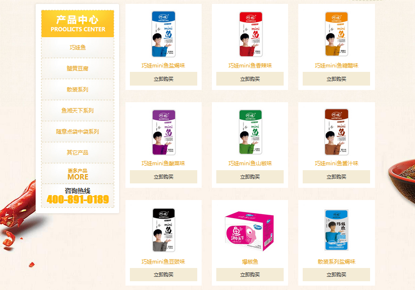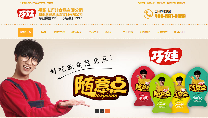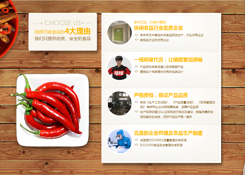 在設計方面,項目組為巧娃食品量身定制一條設計主線,包括主輔色調、營銷板塊邏輯和營銷內循環。相比舊站廣告圖充分利用了代言人“華晨宇”明星引力塑造網站品牌形象,提升公信力;局部板塊設計引入餐桌直線俯視效果,加強網站代入感;新站產品分類更明細更有重點這樣一來,用戶就能一進入到網站就可以接受產品的信息,配合JS動效給產品增加一定的趣味性,接受度更高。