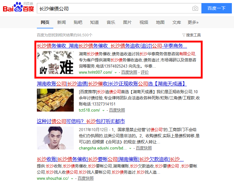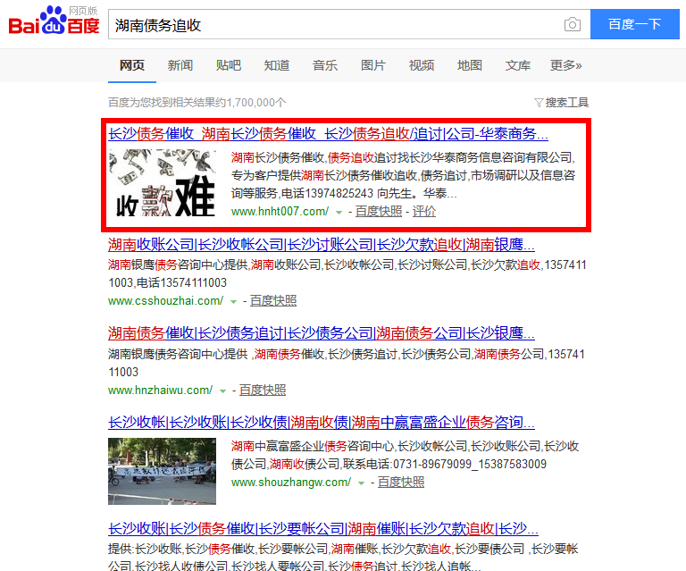 長沙華泰商務(wù)信息咨詢有限公司在我司關(guān)鍵詞優(yōu)化開始時間是2017年10月14日,11月9日長沙債務(wù)催收,湖南債務(wù)追收,長沙催債公司等6個關(guān)鍵詞都排名百度首頁,當(dāng)天客戶與我司簽訂了保詞合同,保詞服務(wù)時間是10個月。