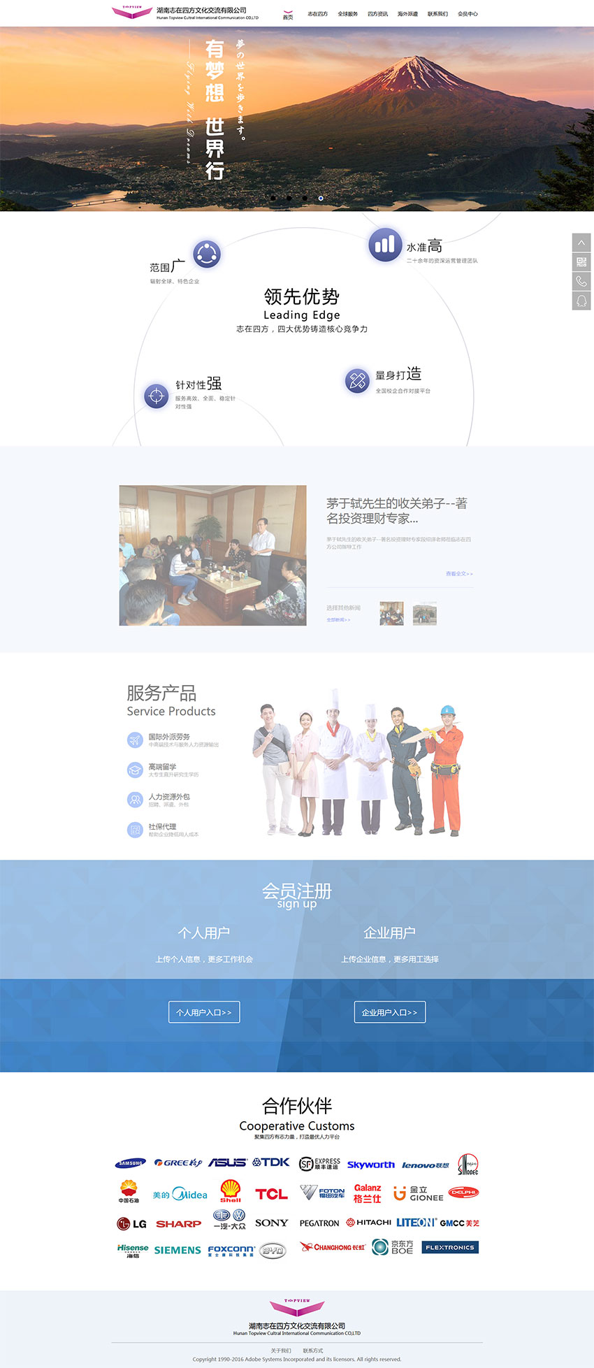 網站采用白色和藍色為主色調,版式設計上采用簡潔的風格,無過度的裝飾,減少視覺干擾,突出主要內容,給客戶一目了然的感受。更加符合志在四方文化交流有限公司沉穩智慧的寓意。