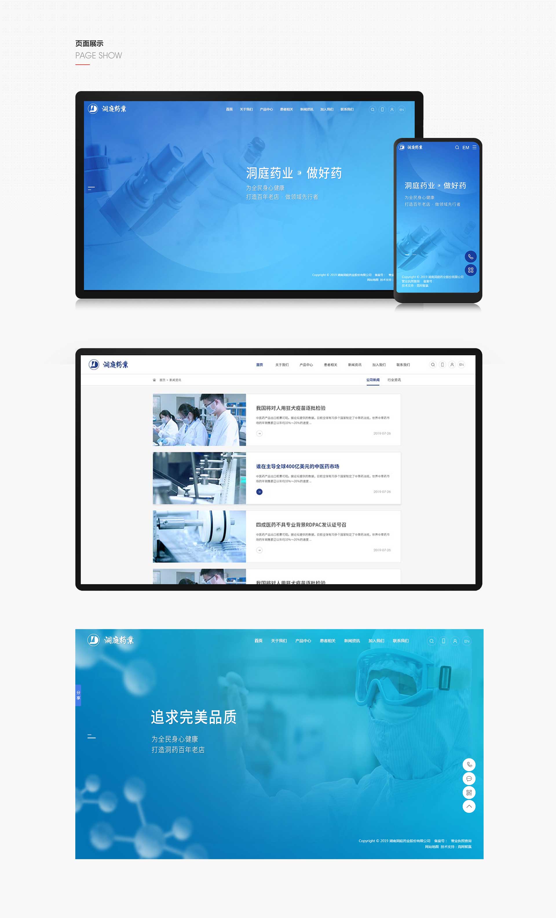 一屏式首頁(yè),簡(jiǎn)約大氣,配色運(yùn)用了VI色系科技藍(lán),同時(shí)搭配生物制藥元素等元素構(gòu)成一個(gè)整體畫(huà)面,彰顯品牌實(shí)力