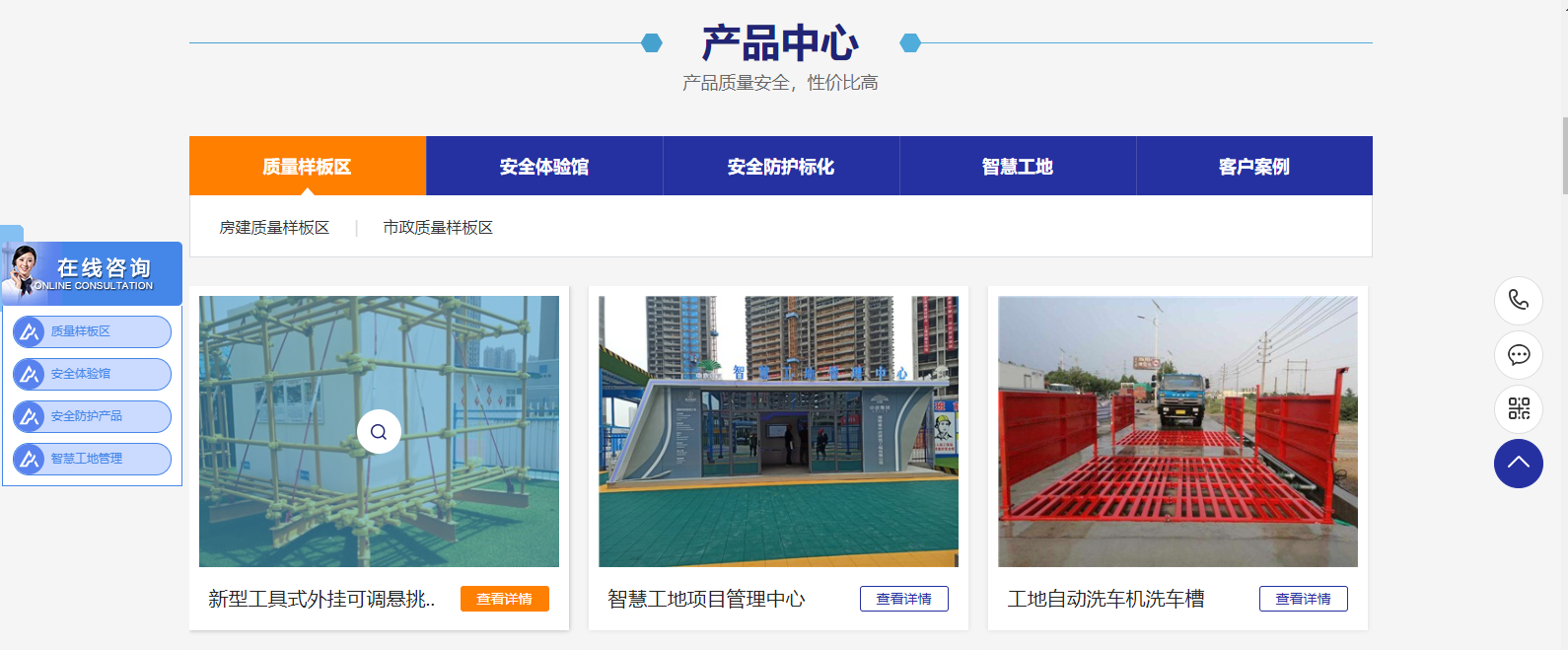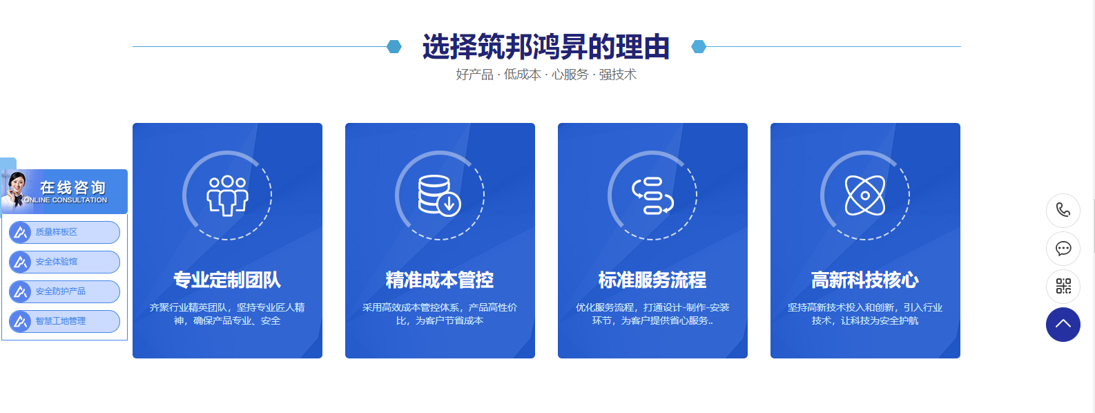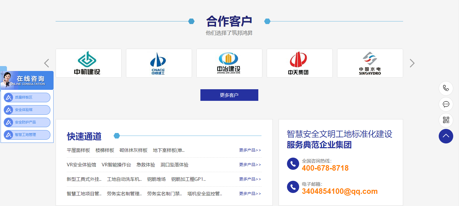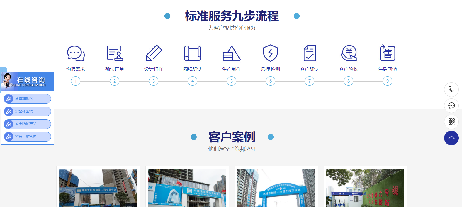 網站主欄目:首頁、質量樣板區、安全體驗館、安全防護標化、智慧工地、客戶案例、企業資訊、關于筑邦、聯系我們