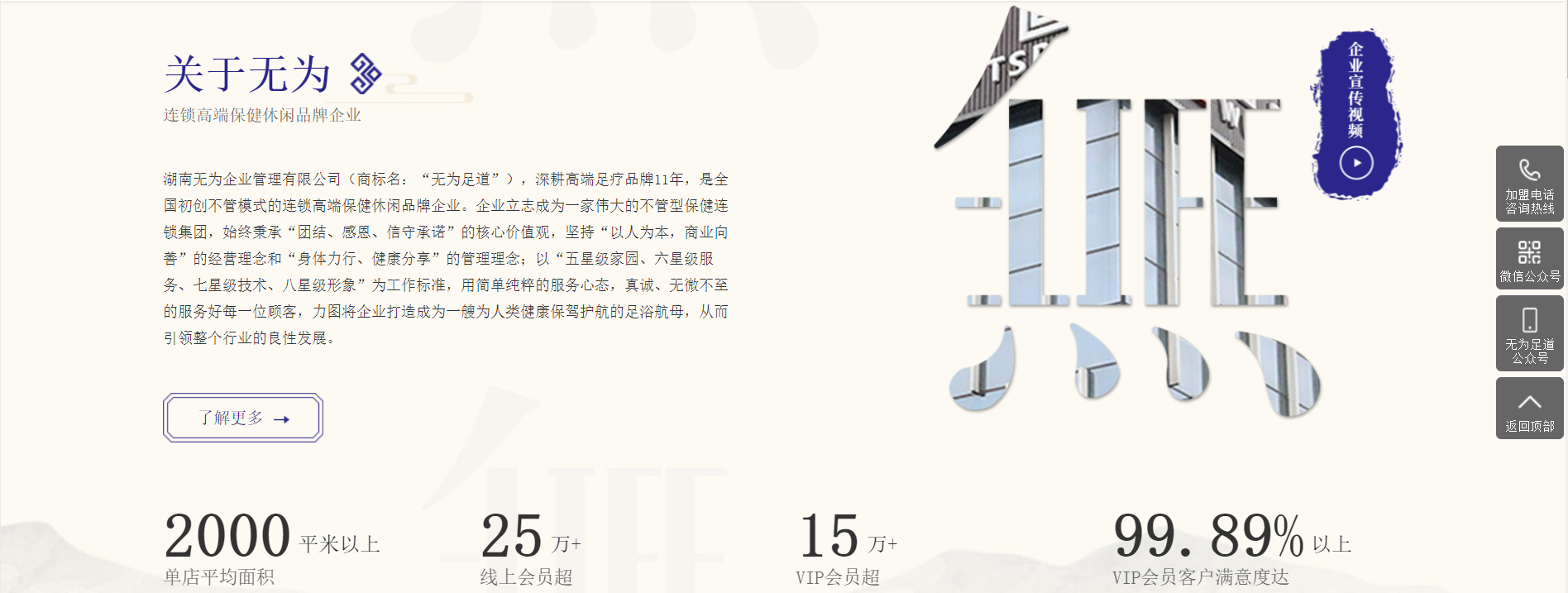 簡介:湖南無為企業管理有限公司深耕高端足療品牌11年,是全國初創“不管模式”的連鎖高端保健休閑品牌企業。用簡單純粹的服務心態,真誠、無微不至地服務好每一位顧客。