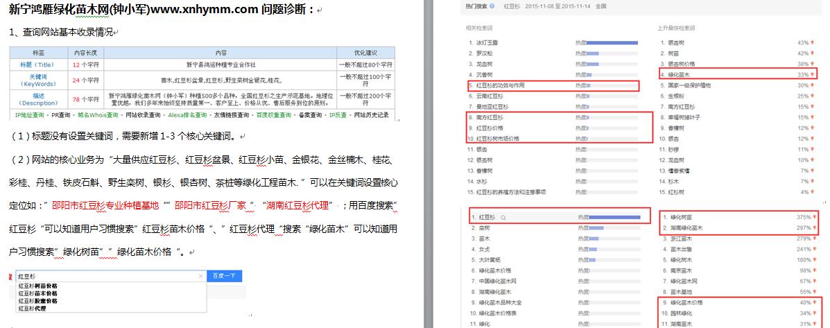 說起鴻運種植,也算是競網的老客戶了。鴻運種植位于世界自然遺產地邵陽市新寧縣,以供應紅豆杉、桂花、野生欒樹、銀杉為主,在與我司合作的兩年時間內,網站一直很少更新。對于網絡營銷,鐘先生其實是非常想關注的,但顧慮到工作忙碌而且網絡知識有限,網站的維護成為了他很頭疼的問題,競網客服人員陳凱了解到這個情況后,積極與客戶溝通,分析了企業核心優勢,產品結構,抓住了客戶想要主推的產品和關鍵詞,在此基礎上完成了一套針對性很強的診斷書,在獲得了客戶的同意的第二天,網站維護人員就開始執行網站優化。