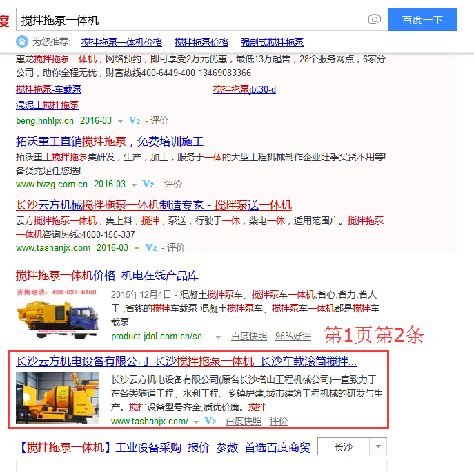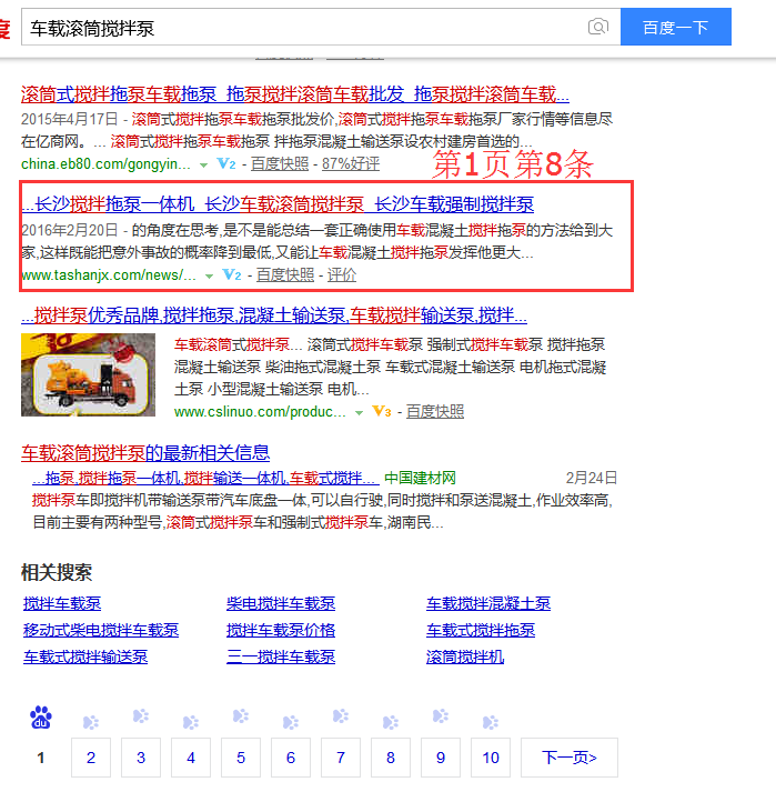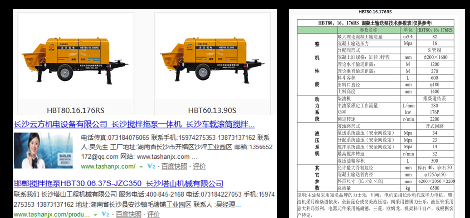 站內方面,網站分析結果顯示產品內容少,產品內容頁為JPG格式不利于搜索引擎收錄,項目通過百度指數搜集一批關注度高、檢索量高的關鍵詞,優化網頁標題,將熱點詞植入文章、新聞、案例中。同時,在產品詳情頁內新增可抓取的“攪拌拖泵一體機”“攪拌拖泵報價”“混泥土車載泵型號”“混泥土車載泵價格、租賃”等比較感興趣的內容,以此幫助提高速度。
