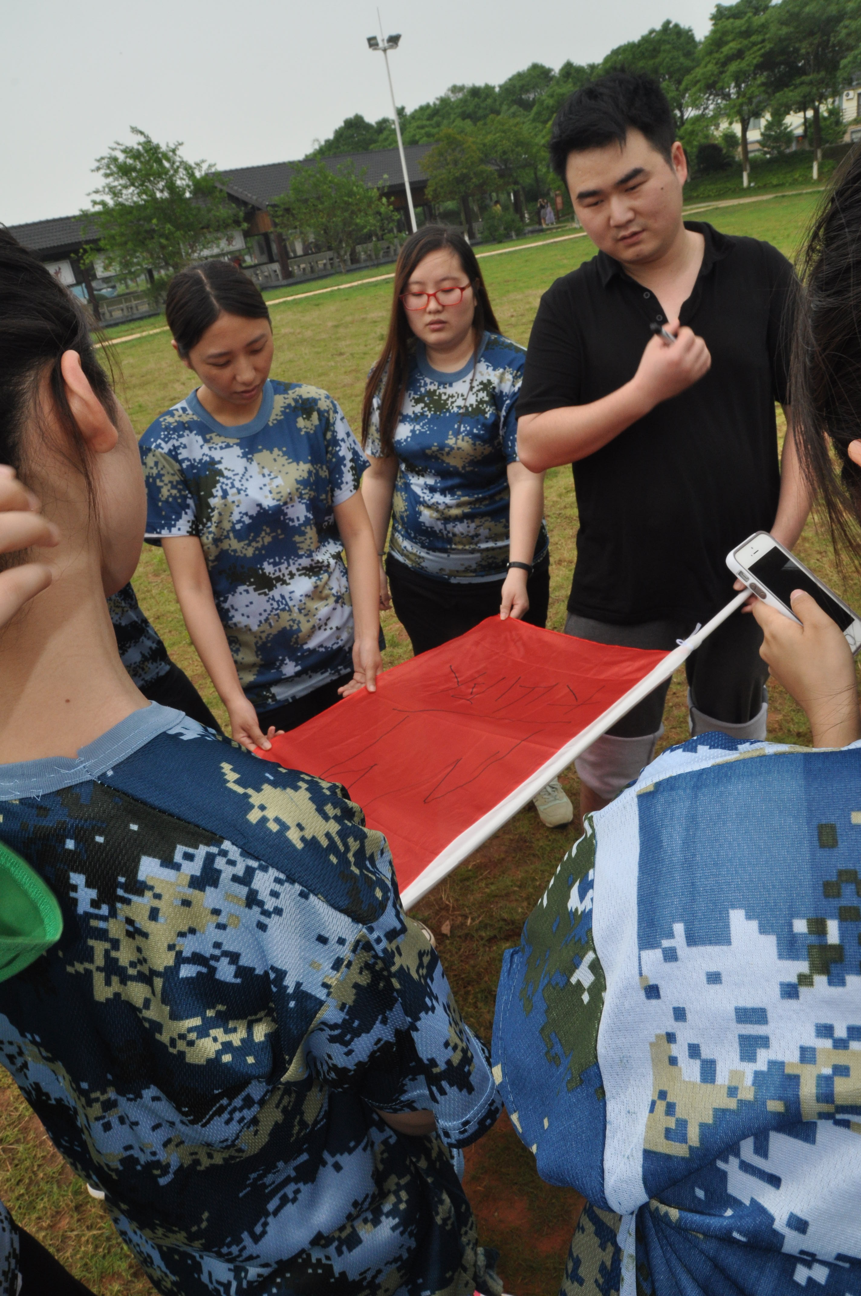 一開始大家躍躍欲試,但事實發現,單靠個人根本無法通過。于是,在隊長的安排下,先嘗試過去幾個隊員,雖然通過的過程很艱難,而且剛開始屢屢“觸電”,只好重新來過。大家冷靜下來,進行了嚴密的分工,有人指揮,有人幫助、有人監護,“抱、抬、托、舉”,各種手段都用上了,最終大家全部順利鉆過了“電網”。