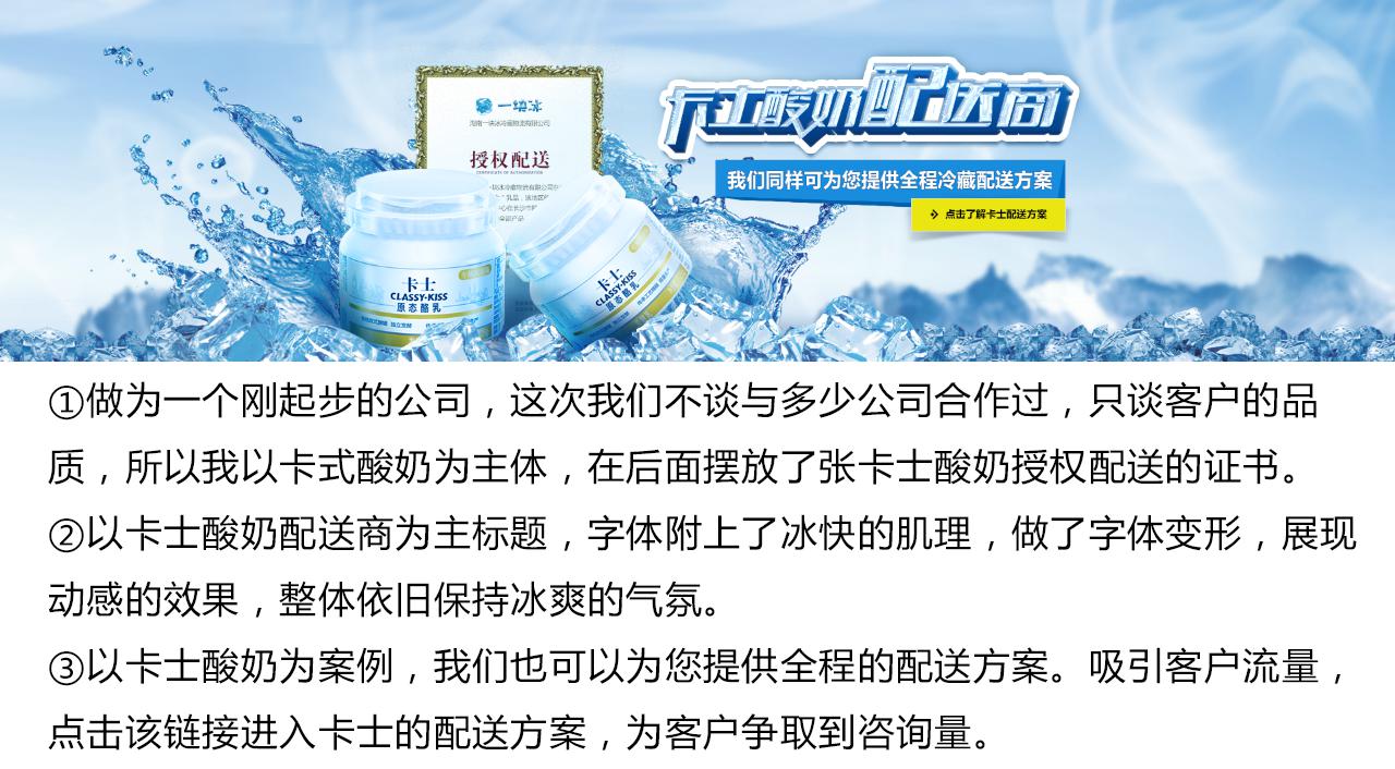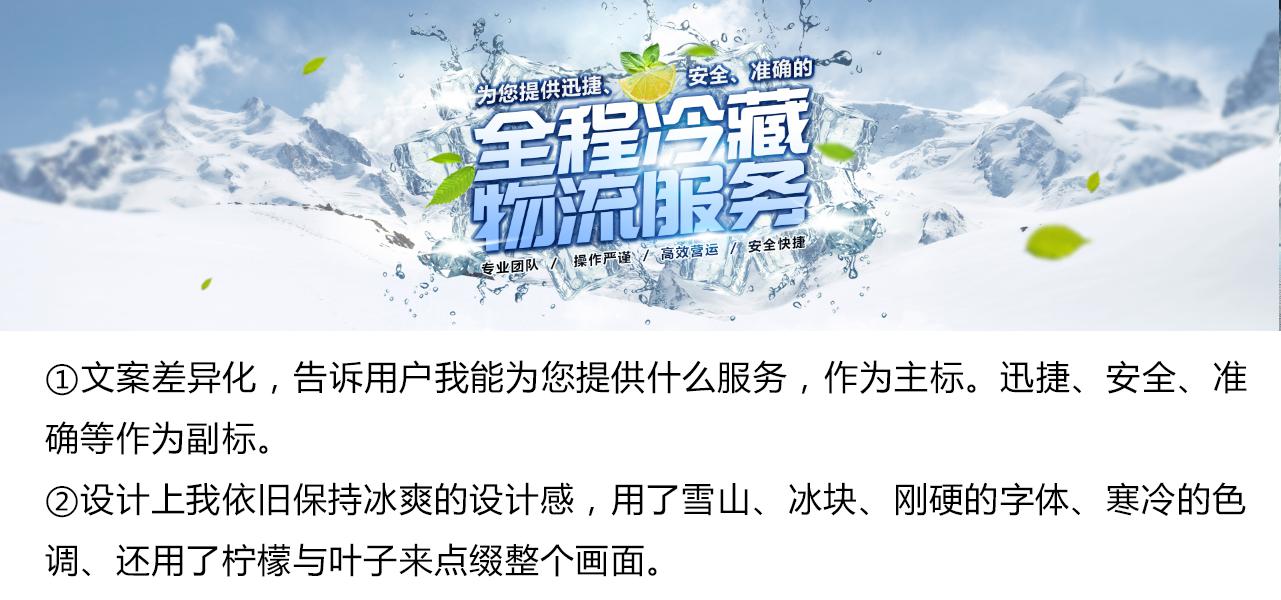 競網建站設計師王敏:你可以從服裝看出一個人品味,也可以從logo看出一個團隊的文化。公司名稱新奇有創意 ,代表這是一群年輕、不拘一格的團隊;LOGO顏色清新簡潔,而且是冰塊,所以整個網站要很冷,所以整個網站,通過白配藍營造出冰冷感。