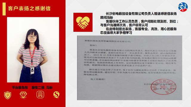 霜降雖至,陽光依好,競網建站微信群熱鬧非凡,被一封來自長沙創電數控設備有限公司(以下簡稱長沙創電數控)的感謝信刷爆了,競網建站客服馮盼憑借高效溝通、專業服務獲得了大伙兒一致點贊。