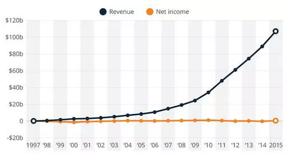 一直都對于貝佐斯的“new philosophy”很感興趣。舉一個最直接的例子,如下圖所示,自1997年上市以來亞馬遜的營業收入呈近指數式增長,但在絕大部分時候,都是在賠錢的。貝佐斯是怎么想的?又是如何說服華爾街和投資人的呢?