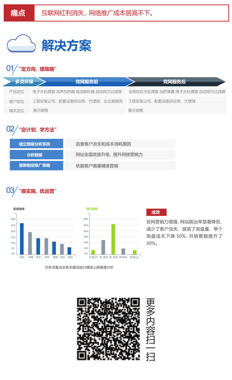 2004 年,多靈環保開始觸網,逐漸從一家僅 3 人的小作坊轉型成為一個行業排名前三的制造企業,90% 以上的新客戶來源于互聯網。2015 年開始,互聯網紅利逐漸消失,企業對線上流量的爭奪越來越激烈。在制造行業整體疲軟、同行競爭激烈的情況下,多靈環保升級互聯網營銷系統,業績逆勢上揚,產品供不應求,遠銷加拿大、澳大利亞、韓國等國。