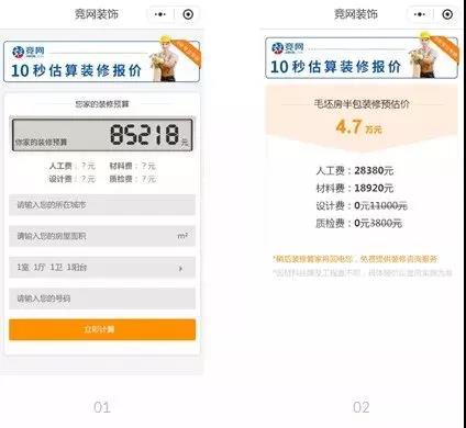 1、免費(fèi)報(bào)價(jià)輸入面積匹配生成房屋戶型,輸入手機(jī)號碼,提交后自動(dòng)按照每平米()裝修價(jià)格計(jì)算,生成房屋裝修初步總報(bào)價(jià),細(xì)分到材料費(fèi)、人工費(fèi)、設(shè)計(jì)費(fèi)、質(zhì)檢費(fèi)。