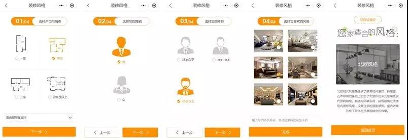 按照四個(gè)步驟,第一步選擇戶型、城市;第二步選擇性別;第三步選擇年齡;第四步選擇風(fēng)格、輸入手機(jī)號碼提交,輸出風(fēng)格測試結(jié)果。