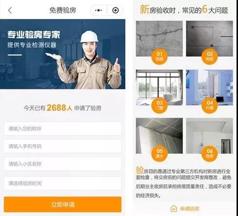 輸入稱呼、手機(jī)號碼、小區(qū)名稱、驗(yàn)房時(shí)間,獲取免費(fèi)驗(yàn)房,主要檢測裂縫、電路、門窗、外漏、漏水、隱患等。