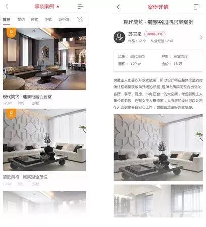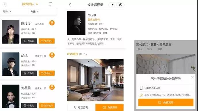 按照風(fēng)格、戶型、面積來篩選案例,圖片進(jìn)行輪播展示,可以關(guān)聯(lián)對應(yīng)的設(shè)計(jì)師,可微信/電話預(yù)約設(shè)計(jì)服務(wù)。