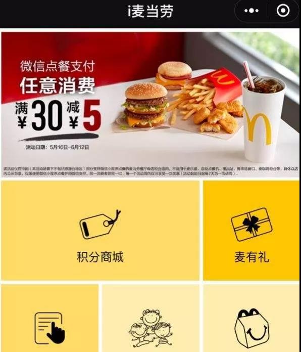 例如,麥當(dāng)勞使用積分兌換來提高用戶粘性。麥當(dāng)勞小程序本身就具有品牌優(yōu)勢(shì),自然是市場(chǎng)上使用次數(shù)較高的一款餐飲類小程序。