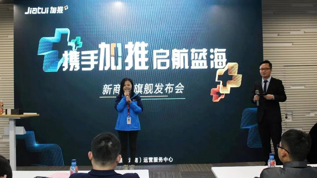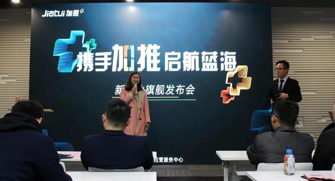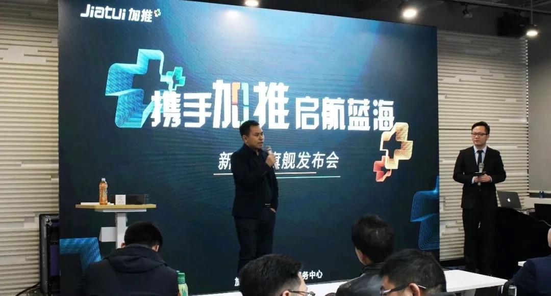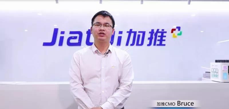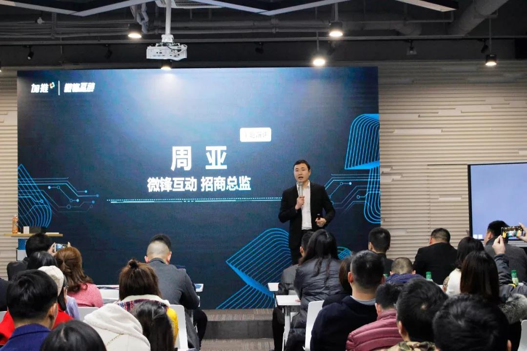 加推科技CMO Bruce借視頻向與會企業家致以問候,并談到加推2019渠道招募計劃,加推已與全國150+城市運營商達成戰略合作。2019年,加推全面開啟招募計劃,期望與更多有志者一同拓荒微信To B領域,搶占億萬級小程序紅利市場。