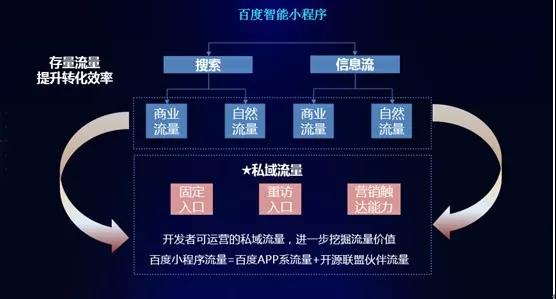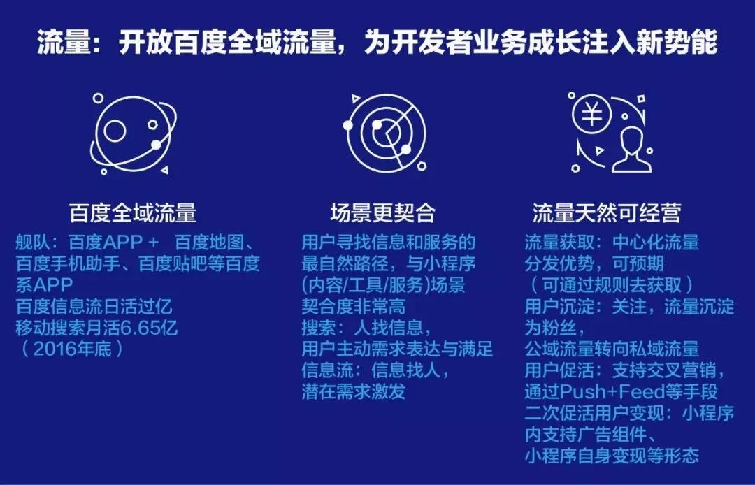 與其他小程序不同的是,百度智能小程序直接把百度全域流量都開放給開發(fā)者,包括百度“搜索+信息流”、百度地圖、百度手機(jī)助手、百度貼吧等百度系應(yīng)用的流量。