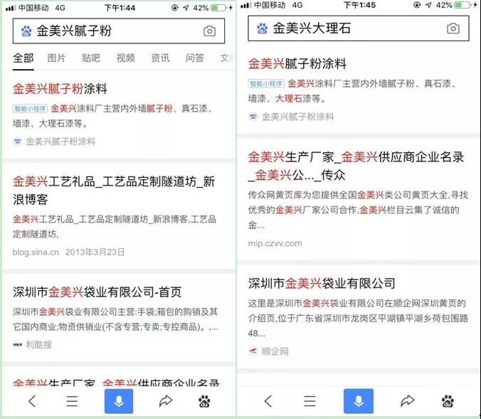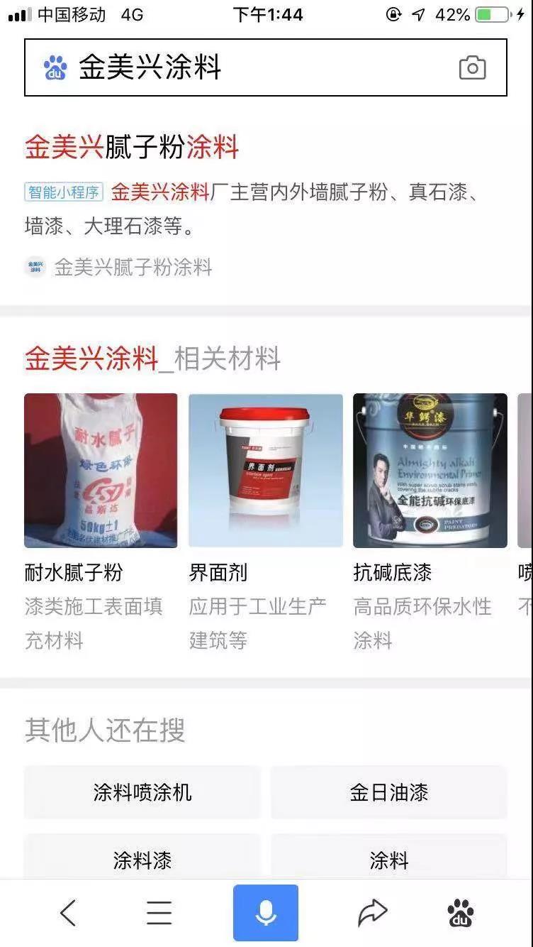除了精準搜索,在百度移動端,搜索相關詞,也能展現相關百度智能小程序。如搜索“金美興膩子粉”、“金美興大理石”都能搜索到“金美興膩子粉涂料”百度智能小程序。