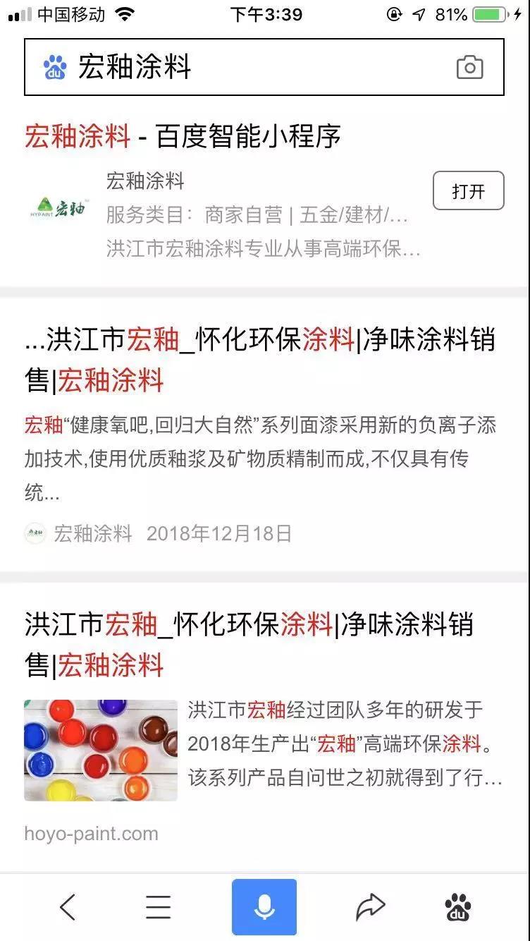 搜索“宏釉涂料”也能在首頁找到其百度智能小程序。