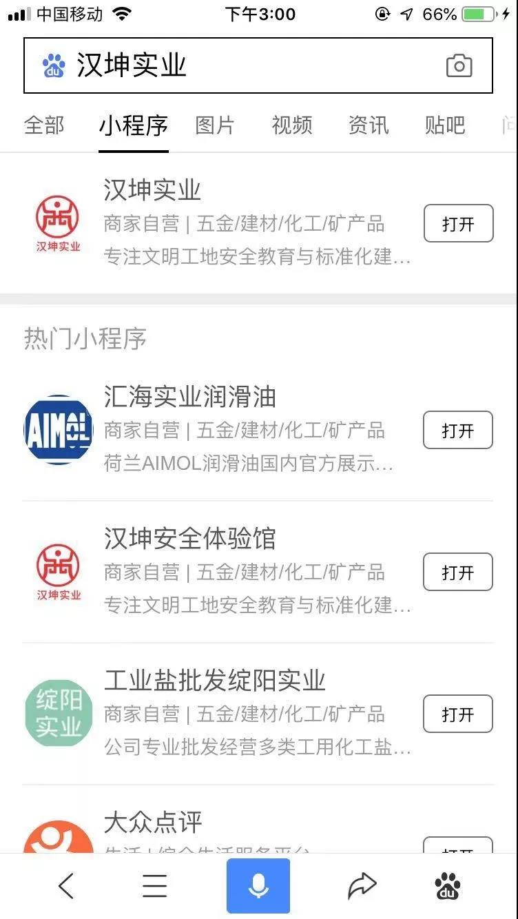 如果你需要做多個品牌關鍵詞,在百度移動端選擇“小程序”專頁,所有相關小程序都能出現。如搜索“漢坤實業(yè)”,在“小程序”專頁就能出現所有相關的小程序,多詞霸屏,品牌視覺影響力棒棒噠。