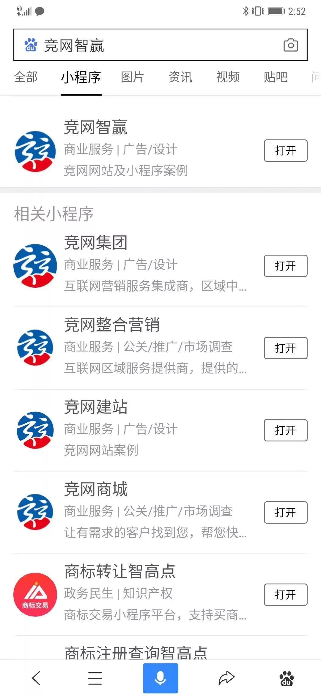 如搜索“競網”,選擇“小程序”專頁,則出現了“競網智贏”、“競網集團”、“競網建站”、“競網商城”、“競網整合營銷”等五個百度智能小程序。