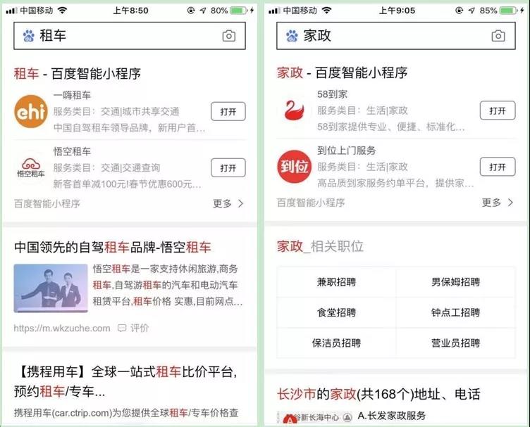 搜索租車、家政,也能在首頁展示相關業(yè)務的百度智能小程序。