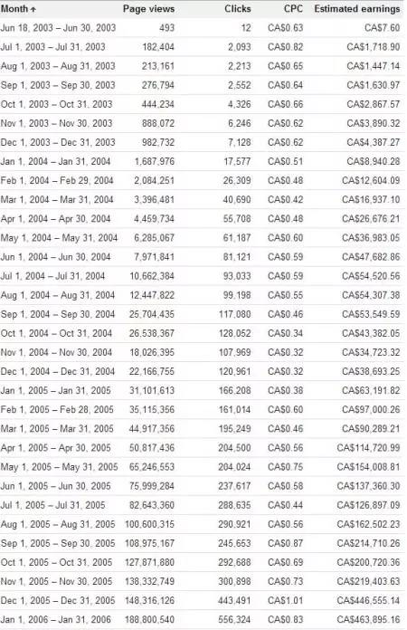 2003年6月,只有493個瀏覽量,廣告收入7.6加拿大元(差不多跟美元等值);2013年7月,就有了18萬多的瀏覽量,廣告收入1千7百多了。慢慢每月穩步遞增,道理2004年2月,廣告收入已經到了1萬2千多了。2004年6月的收入,突破了5萬塊錢。2005年4月,月收入突破10萬元。