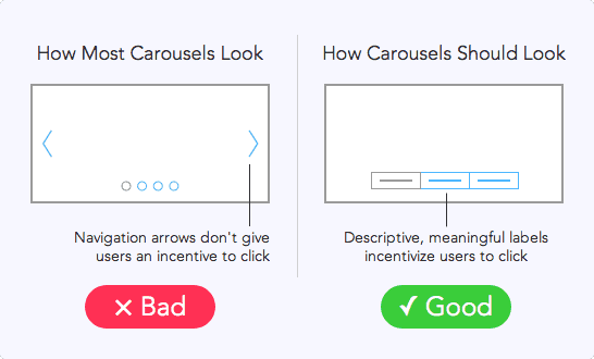 在輪播圖上的導航箭頭并不能給用戶予點擊的動機。其之所以失敗是由于它并沒有描述任何“如果我點了它會發生什么”的信息。用戶在一片迷茫之際不得不把注意力放在其它一些信息元素上。箭頭的圖標只能告訴用戶還有更多的輪播圖可以瀏覽,但并不足以形成點擊的動機。不僅如此,用戶還經常會忽略掉導航箭頭——它們一直是如此之小并緊貼在輪播圖的邊緣。正由于這種種,除了第一頁的其它頁面不被點擊也在情理之中。