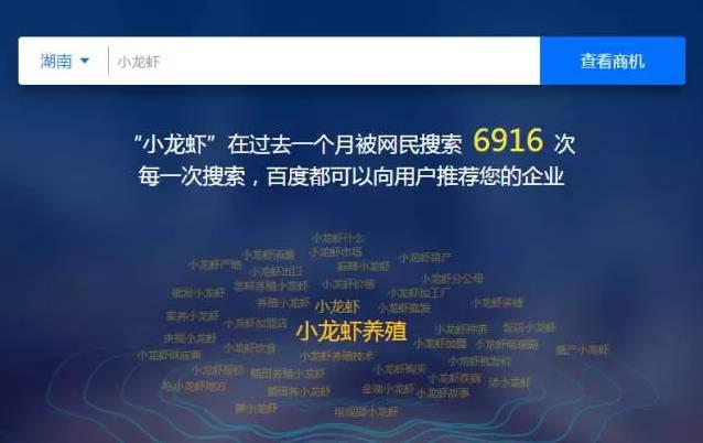 如商戶在搜索框內輸入“小龍蝦”作為關鍵詞,點擊“查看商機”即可看到“小龍蝦”過去一個月湖南用戶的搜索次數、使用百度推廣的小龍蝦商戶數量、每家商戶的平均月推廣花費以及平均月導流點擊量,幫助推廣新商戶快速找準定位。
