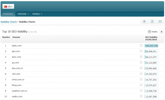 據Searchmetrics數據顯示,baidu.com這個域名的曝光度得分超過了4億,這是其他任何一個網站無法匹敵的。做個比較,在同一時間范圍內,美國維基百科wikipedia.org的曝光度得分僅為5000萬左右。